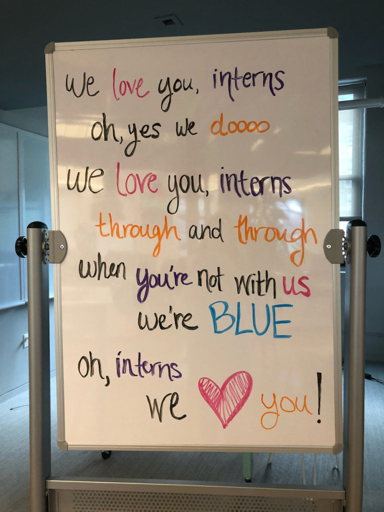 July 26th was National Intern Day, so our NYC office celebrated accordingly! To show the four summer 2018 interns, Naomi, Haley, Kelly, and myself, how much Updater cares, our managers and the People Experience team planned a day full of special surprises. We were taken out to an out-of-this-world taco lunch and greeted with confetti bombers, cookie cake, and notes of appreciation from the entire company upon our return. It was a wonderful day that left our hearts so full!